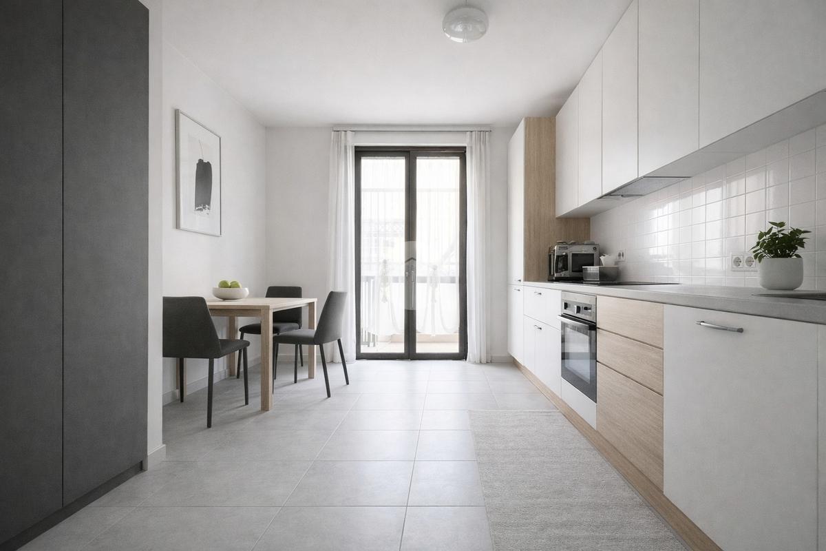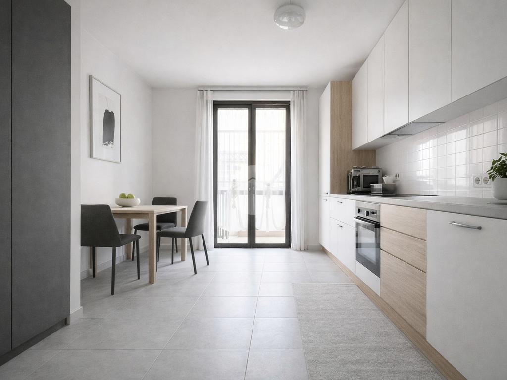Questo accogliente appartamento si apre con un luminoso soggiorno, dotato di attacchi per la cucina, che offre flessibilità e spazio per rilassarsi e intrattenere. La cucina abitabile, separata dal soggiorno, è il luogo ideale per preparare e gustare deliziose pietanze in famiglia, in origine usata come seconda camera da letto.